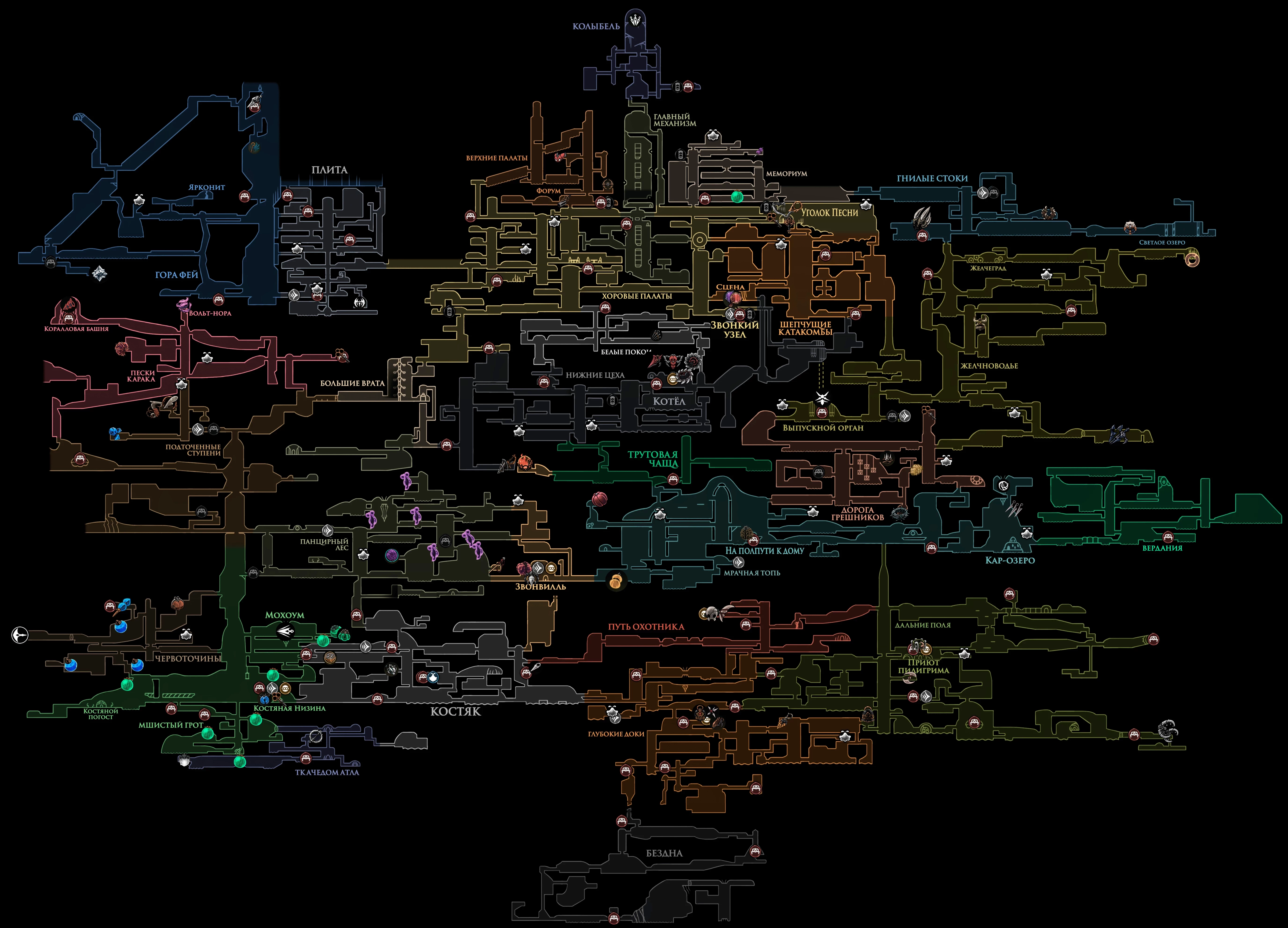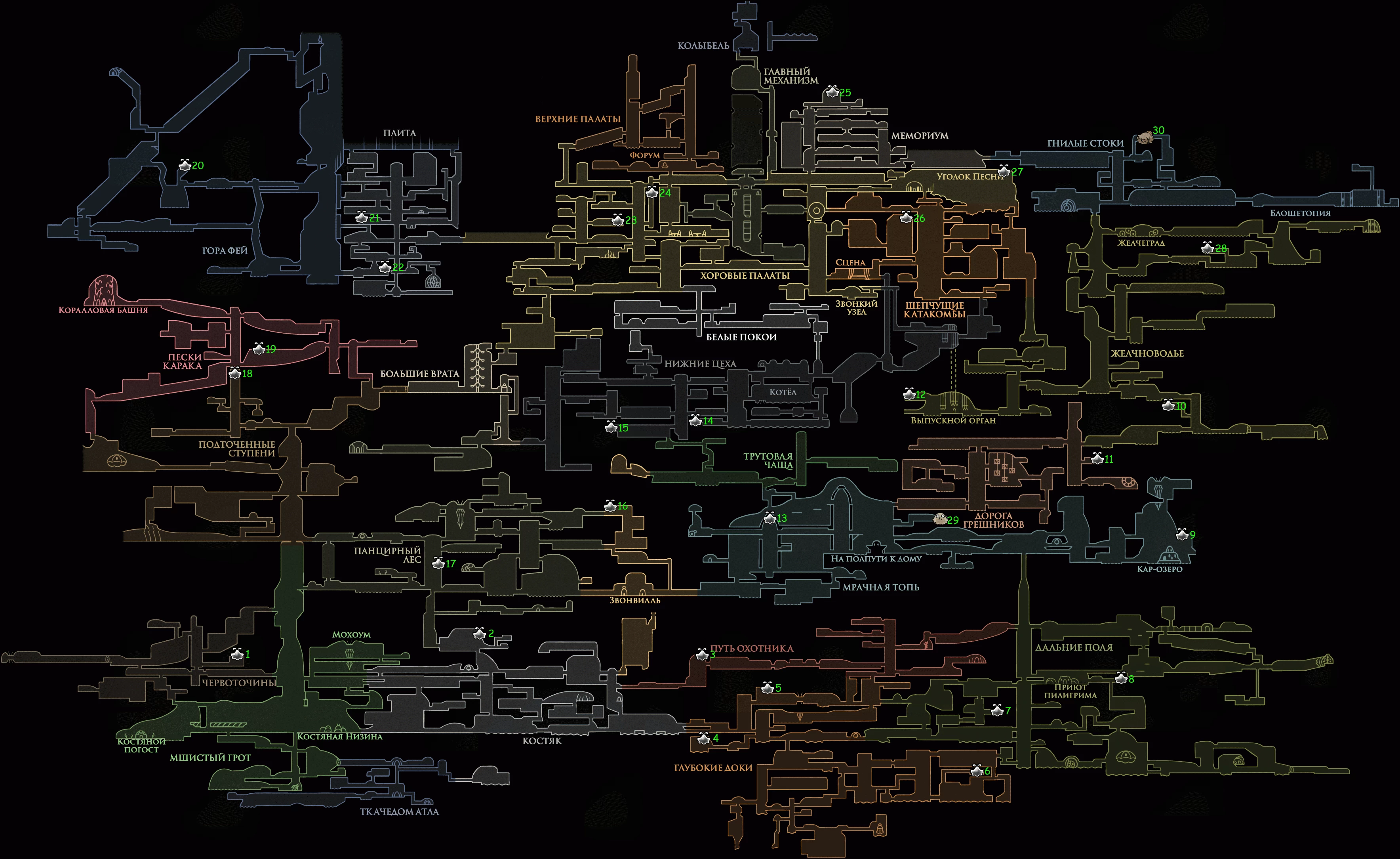 Усвоение (Transported) Получите все Знаки. Всего 7 знаков, они меняют атаки персонажа. 0. Охотник – начальный знак. 1. Жнец – Мрачная топь, Капелла Жнеца, после битвы на арене. 2. Зверь – Путь Охотника, верх, босс: Дикая Зверомуха. 3. Странница – Костяная Низина, запад. Через Червоточины. 4. Архитектор – собрать 10 красных инструментов, купить ключ у Архитектора, отпереть комнату над ним. 5. Ведьма – Шепчущие катакомбы, секретный переход в Желчноводье, на этом пути, в левом тупике нужно взять Искривлённый Бутон, принести Сизокорню в Панцирный лес. 6. Шаманка – 3 акт, получив умение в Бездне, около 3 улиток идём вправо, взлетаем на потолок. |